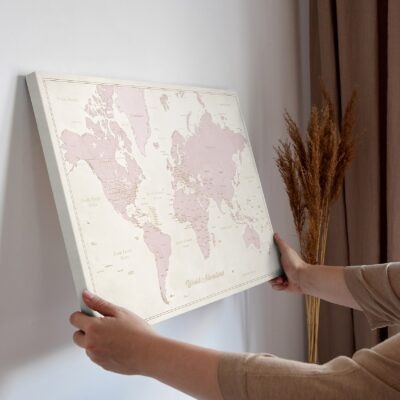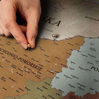 Mapa jest gotowa do powieszenia i nie wymaga dodatkowej ramy. Płótno jest ciasno naciągnięte na ramę z podkładem, dzięki czemu pinezki idealnie przylegają do mapy, umożliwiając zaznaczenie wybranych miejsc.