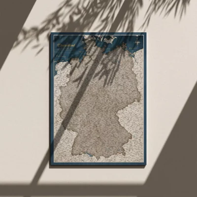 Nasza ręcznie wykonana mapa Niemiec została wykonana z wysokiej jakości bawełnianego płótna, drewnianej ramy i podkładu do wpinania.