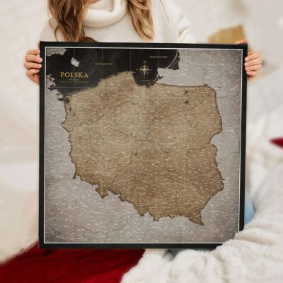 Mapa jest gotowa do powieszenia i nie wymaga dodatkowej ramy. Płótno jest ciasno naciągnięte na ramę z podkładem, dzięki czemu pinezki idealnie przylegają do mapy, umożliwiając zaznaczenie wybranych miejsc.