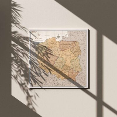 Nasza ręcznie wykonana mapa Polski została wykonana z wysokiej jakości bawełnianego płótna, drewnianej ramy i podkładu do wpinania.