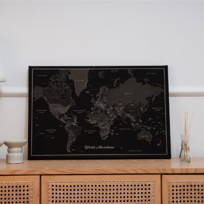 Mapa jest gotowa do powieszenia i nie wymaga dodatkowej ramy. Płótno jest ciasno naciągnięte na ramę z podkładem, dzięki czemu pinezki idealnie przylegają do mapy, umożliwiając zaznaczenie wybranych miejsc.