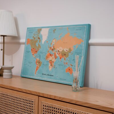 Nasza mapa oferuje możliwość przypinania odwiedzonych miejsc, dzięki czemu wspomnienia z podróży nigdy nie wyblakną. Dzięki drukowaniu w wysokiej rozdzielczości, odwzorowanie wszystkich krajów oraz większych wysp. Solidna, trwała konstrukcja mapy sprawia, że jest to wytrzymały element, który przetrwa twoje podróże.