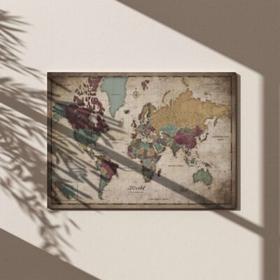 Nasza ręcznie wykonana mapa świata została wykonana z wysokiej jakości bawełnianego płótna, drewnianej ramy i podkładu do wpinania.