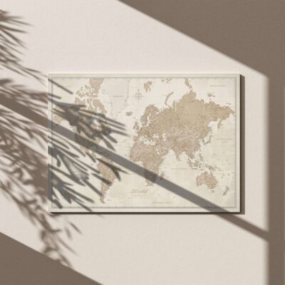 Nasza ręcznie wykonana mapa świata została wykonana z wysokiej jakości bawełnianego płótna, drewnianej ramy i podkładu do wpinania.