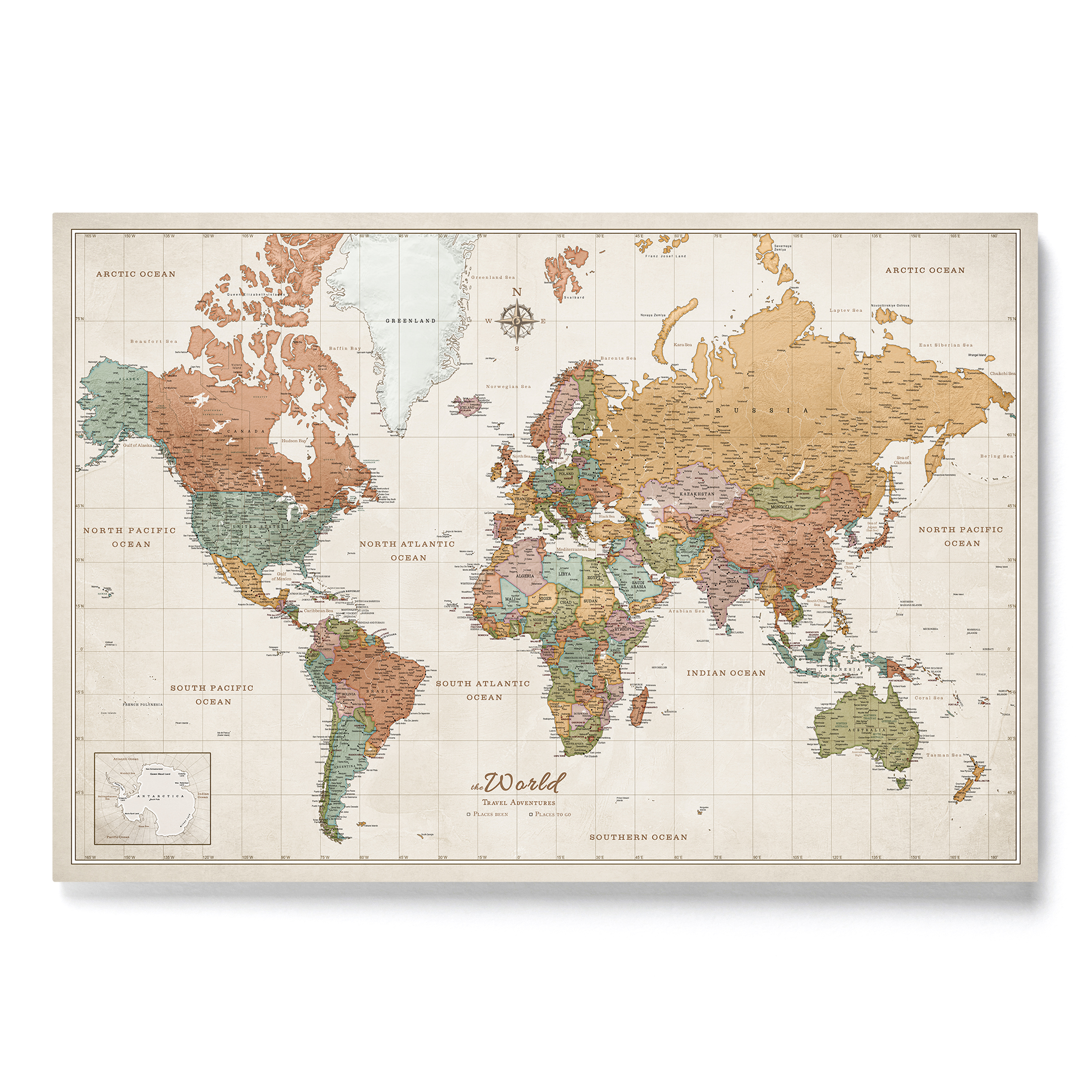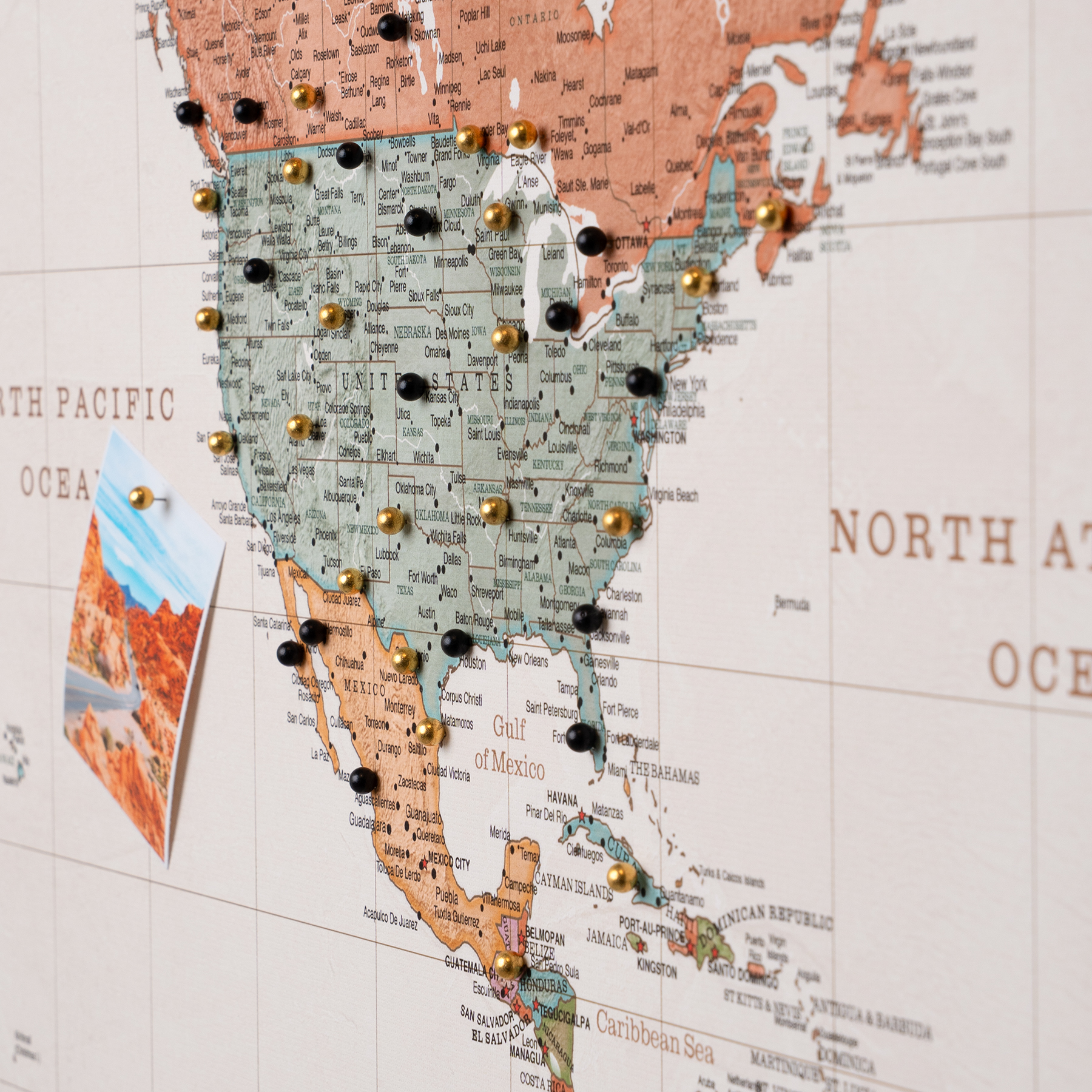 Nasza mapa oferuje możliwość przypinania odwiedzonych miejsc, dzięki czemu wspomnienia z podróży nigdy nie wyblakną. Dzięki drukowaniu w wysokiej rozdzielczości, odwzorowanie krajów, stolic, miast, oceanów i mórz jest aktualne i bardzo szczegółowe. Solidna, trwała konstrukcja mapy sprawia, że jest to wytrzymały element, który przetrwa twoje podróże.