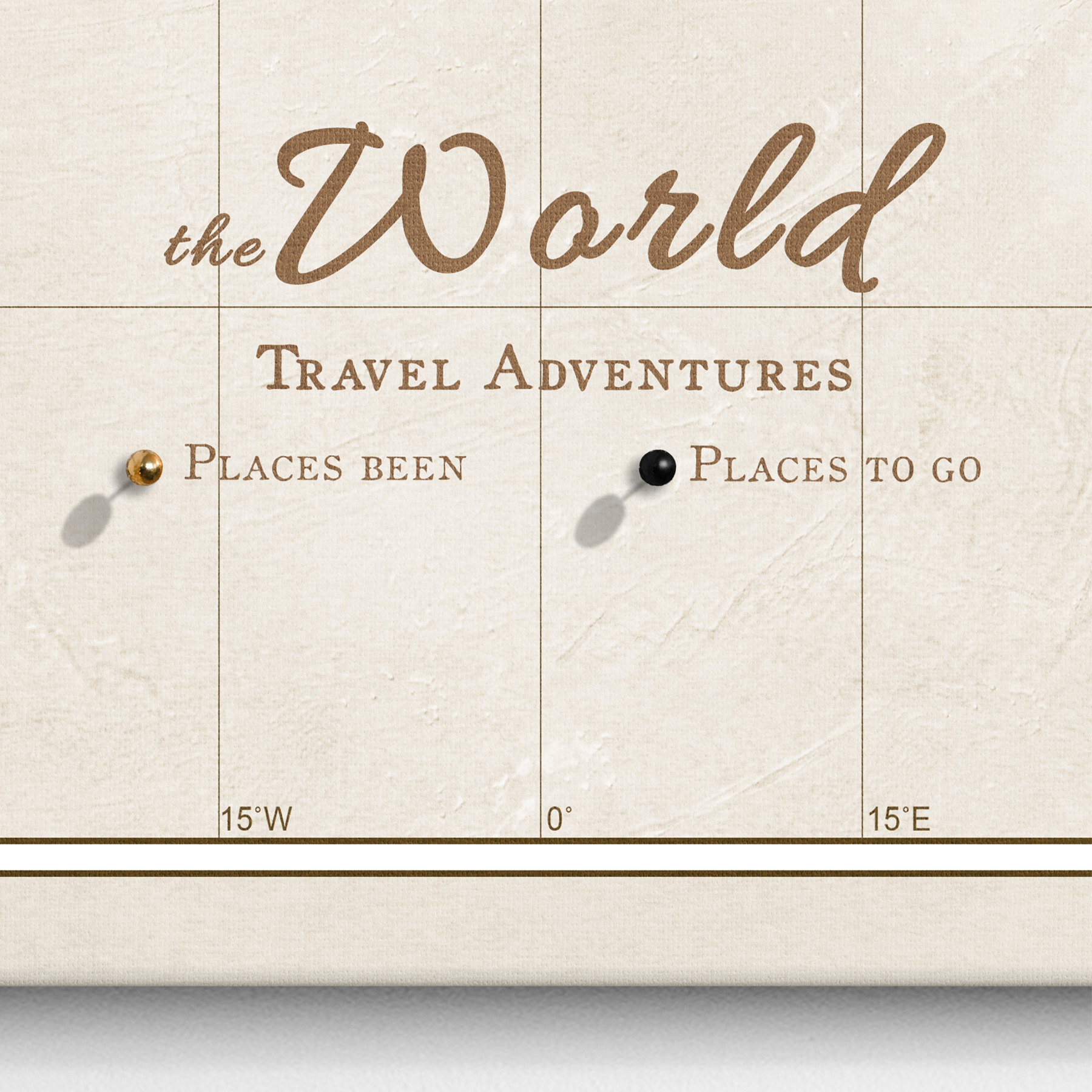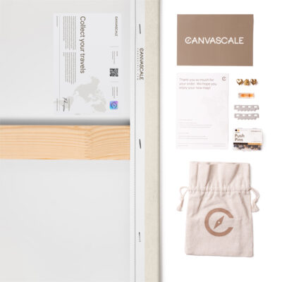 Mapa jest gotowa do powieszenia i nie wymaga dodatkowej ramy. Płótno jest ciasno naciągnięte na ramę z podkładem, dzięki czemu pinezki idealnie przylegają do mapy, umożliwiając zaznaczenie wybranych miejsc.