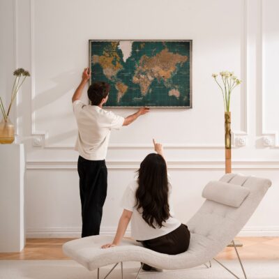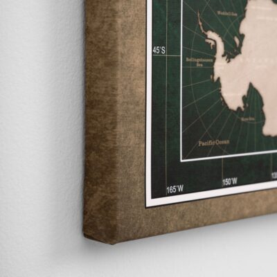 Mapa jest gotowa do powieszenia i nie wymaga dodatkowej ramy. Płótno jest ciasno naciągnięte na ramę z podkładem, dzięki czemu pinezki idealnie przylegają do mapy, umożliwiając zaznaczenie wybranych miejsc.
