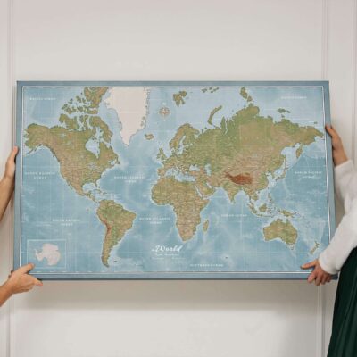 Mapa jest gotowa do powieszenia i nie wymaga dodatkowej ramy. Płótno jest ciasno naciągnięte na ramę z podkładem, dzięki czemu pinezki idealnie przylegają do mapy, umożliwiając zaznaczenie wybranych miejsc.