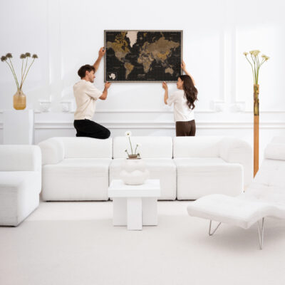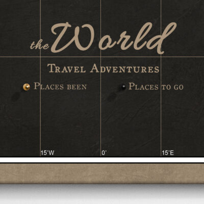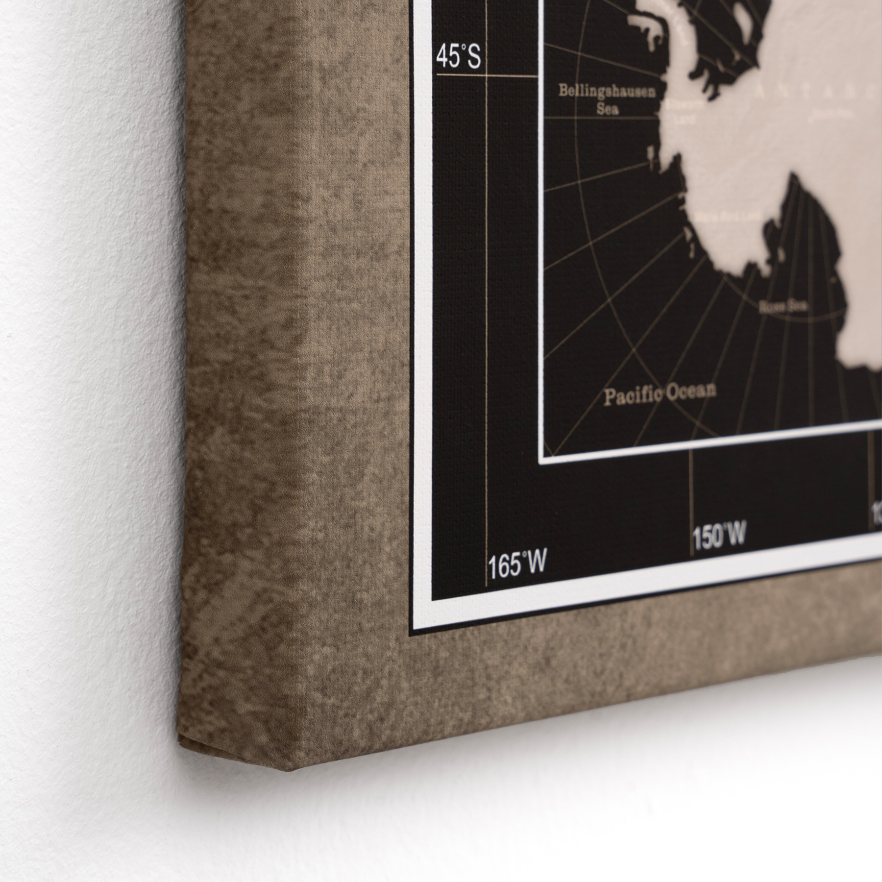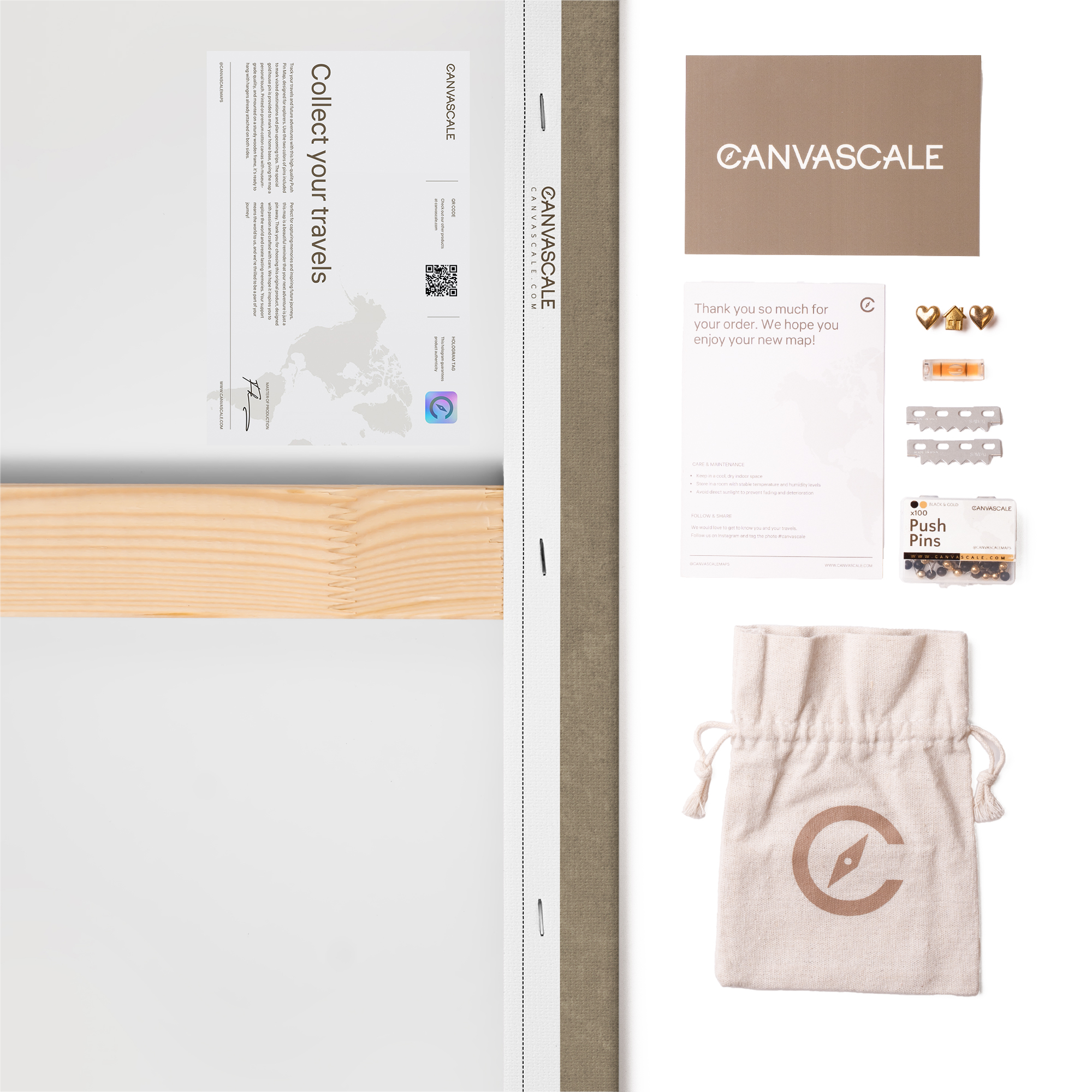 Mapa jest gotowa do powieszenia i nie wymaga dodatkowej ramy. Płótno jest ciasno naciągnięte na ramę z podkładem, dzięki czemu pinezki idealnie przylegają do mapy, umożliwiając zaznaczenie wybranych miejsc.
