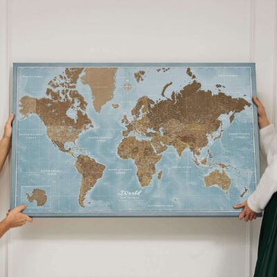 Mapa jest gotowa do powieszenia i nie wymaga dodatkowej ramy. Płótno jest ciasno naciągnięte na ramę z podkładem, dzięki czemu pinezki idealnie przylegają do mapy, umożliwiając zaznaczenie wybranych miejsc.