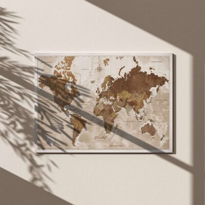 Mapa jest gotowa do powieszenia i nie wymaga dodatkowej ramy. Płótno jest ciasno naciągnięte na ramę z podkładem, dzięki czemu pinezki idealnie przylegają do mapy, umożliwiając zaznaczenie wybranych miejsc.