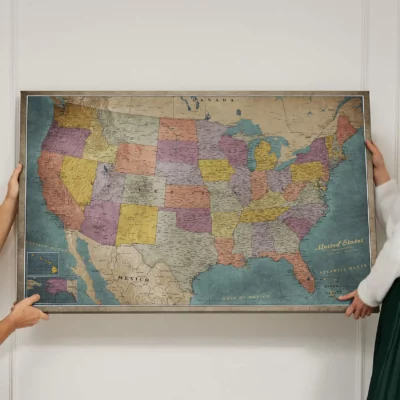 Nasza ręcznie wykonana mapa USA została wykonana z wysokiej jakości bawełnianego płótna, drewnianej ramy i podkładu do wpinania.